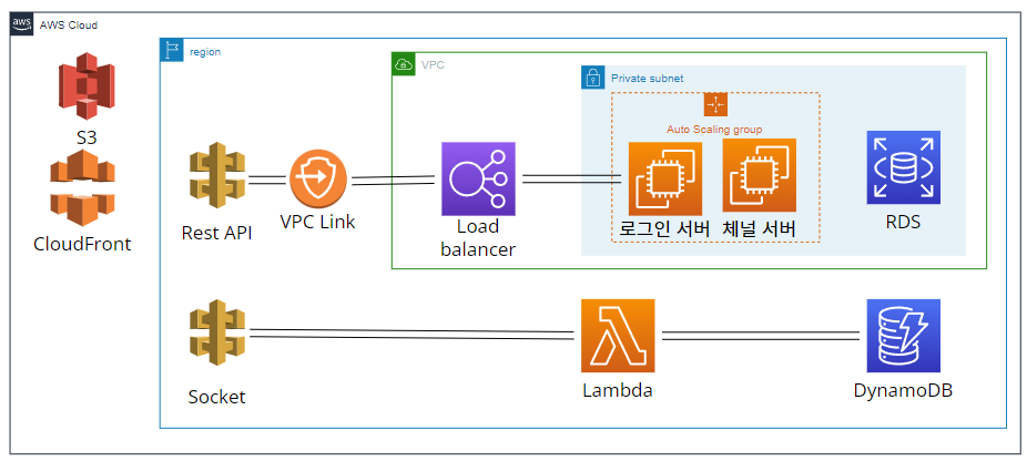 우리가 만들려는 서비스는 실시간 소켓통신 기능이 필수적이다. 그래서 소켓통신을 처리하는 서버와 http메서드를 사용하는 서버를 구분하고 그 중에서도 회원가입, 로그인 등 유저정보를 관리하는 서버와 채팅방 등 채팅관련 데이터를 관리하는 서버를 나눌수 있을 것이라고 판단했다.