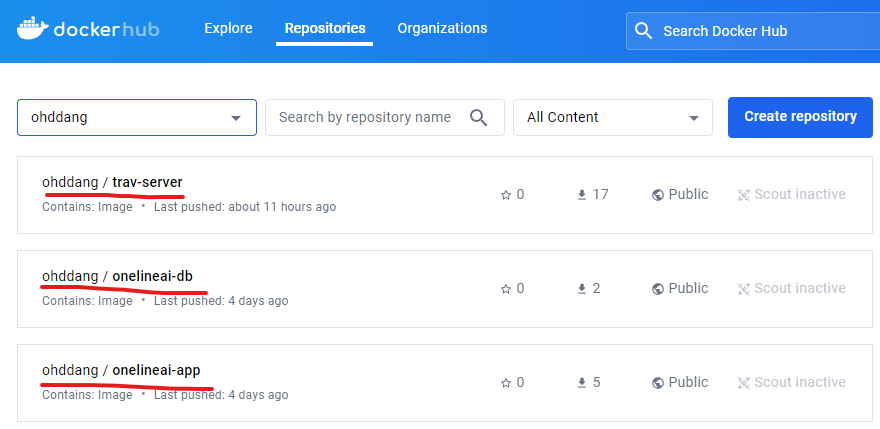 push가 정상적으로 완료됬다면 docker hub에서 이미지들을 확인할 수 있다.