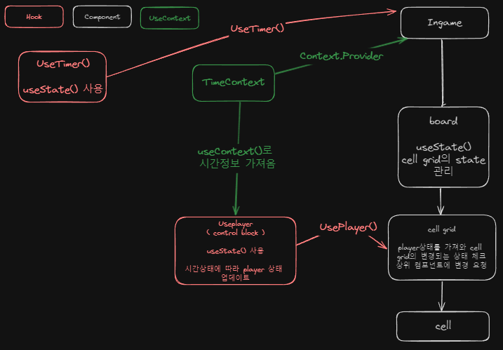 컴포넌트 계층 구조에서 useState를 통한 상태변경 과정을 이해했다..라고 생각하고 react로 작은 프로젝트를 만들어보기로 했다. 테트리스로 정했고 1차적으로 시간 변화에 따라서 내 블록이 이동하는 것까지 구현하기로 했다. 일단 js파일 하나에서 구현했고 다행히..? 금방 완성됬다. 현재 한 파일에 모든 코드가 다 들어가 있어서 별 기능도 없는데도 벌써부터 코드에서 구린내가 나기 시작해서 컴포넌트 별로 분리하고 로직과 렌더링 부분을 분리하기로 마음먹었다. 찾아보니 로직부분은 hook을 이용한다고 한다. hook은 쉽게 말하면 리액트의 함수를 한번 감싸서 내 상황에 맞게 커스터마이징해서 사용한다고 생각하면 된다. 여기서 구조 잡는게 정말 쉽지 않았다.. 이것만 한건 아니지만 거의 반 이상을 투자했는데..